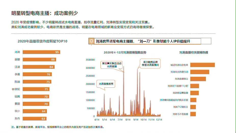 反過來再看劉濤。2020年直播首秀成交額破1.48億元,觀看人次突破2100萬。回顧2020年路人認知度提升明星,劉濤位列第6,出圈事例正是劉一刀淘寶直播,也是唯一一位憑借直播實現(xiàn)出圈的明星。