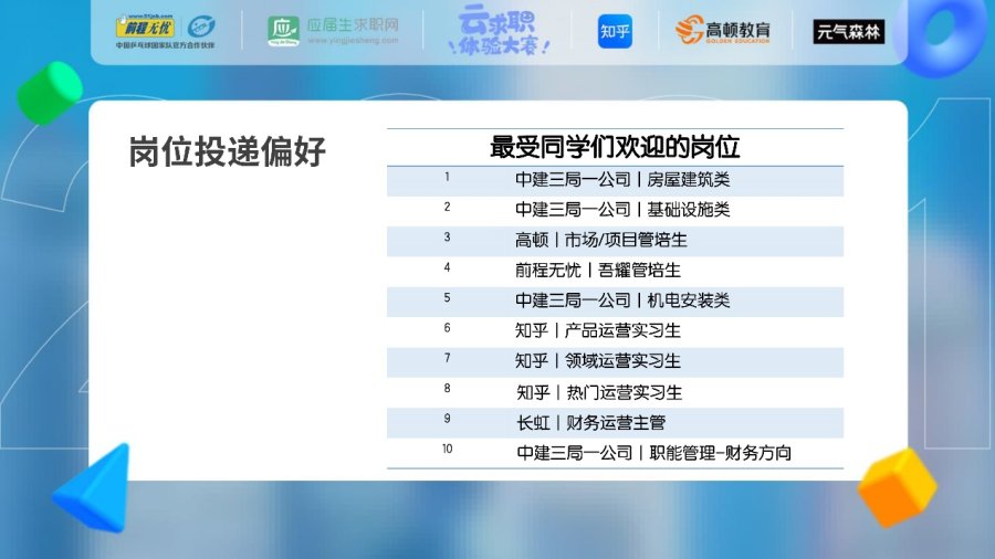 這一點在本次大賽中,也得到了很好的證明,10家企業(yè)提供的54個崗位中,投遞量最高的10個職位分別來自中建三局一公司、知乎,另外高頓及前程無憂的管培生分別排在第三、第四,不難發(fā)現(xiàn),國企、管培、互聯(lián)網(wǎng)對當(dāng)代大學(xué)生來說,更具備吸引力~