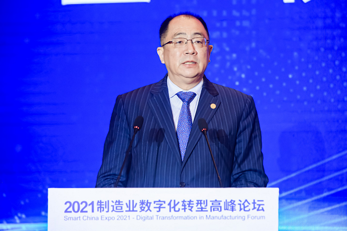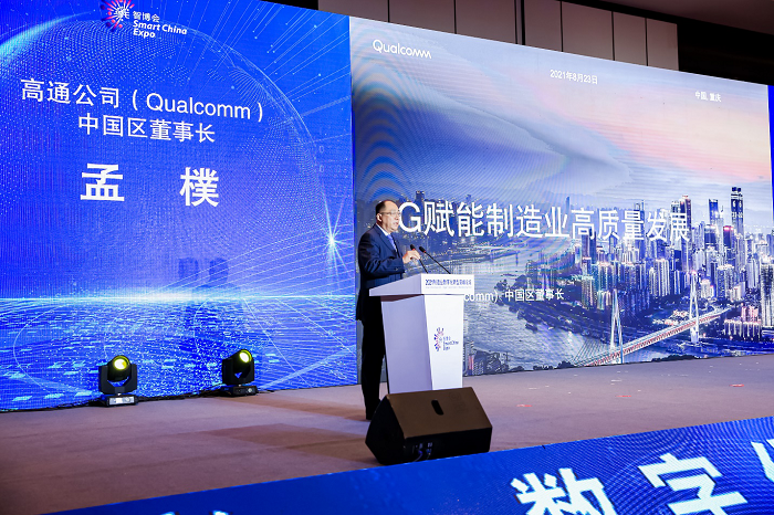 圖為高通公司中國區董事長孟樸在2021智博會制造業數字化轉型高峰論壇上發表演講