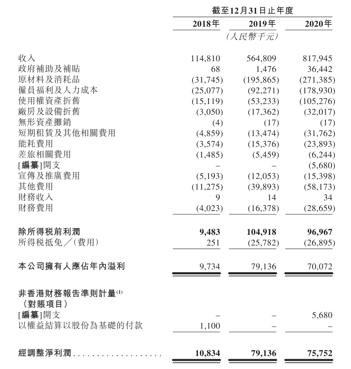 招股書顯示,在過去的2018年、2019年和2020年三個(gè)財(cái)政年度,海倫司的營業(yè)收入分別為1.15億、5.65億和 8.18億元人民幣,相應(yīng)的凈利潤分別為人民幣 973.4萬、7,913.6萬和 7,007.2萬元人民幣。