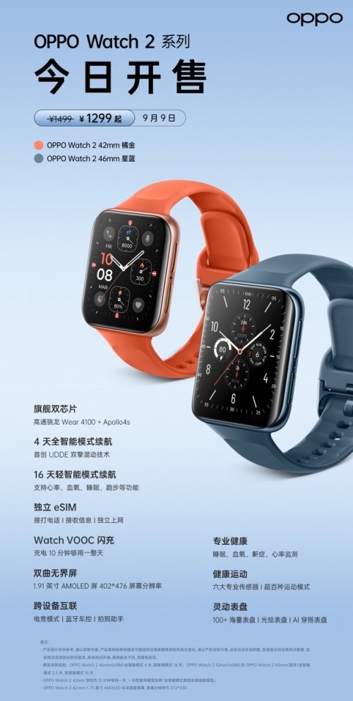 目前,OPPO Watch 2系列星藍版、橘金版已經在OPPO官方授權門店,歡太商城、京東等渠道正式開售,并且全系列降價200元起。如此鉅惠,需要購買OPPO Watch 2手表的小伙伴們千萬不要錯過!