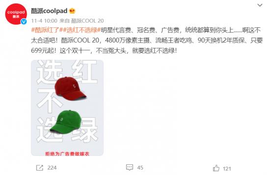另外,酷派雙十一前,連續(xù)三天發(fā)布“選紅不選綠”的微博。因為酷派剛剛更換紅標(biāo),大家又都知道綠廠是OPPO,所以這些圖片擦邊球很明顯,意思就是要大家選酷派,不要選OPPO,并且拉踩OPPO是高價低配。