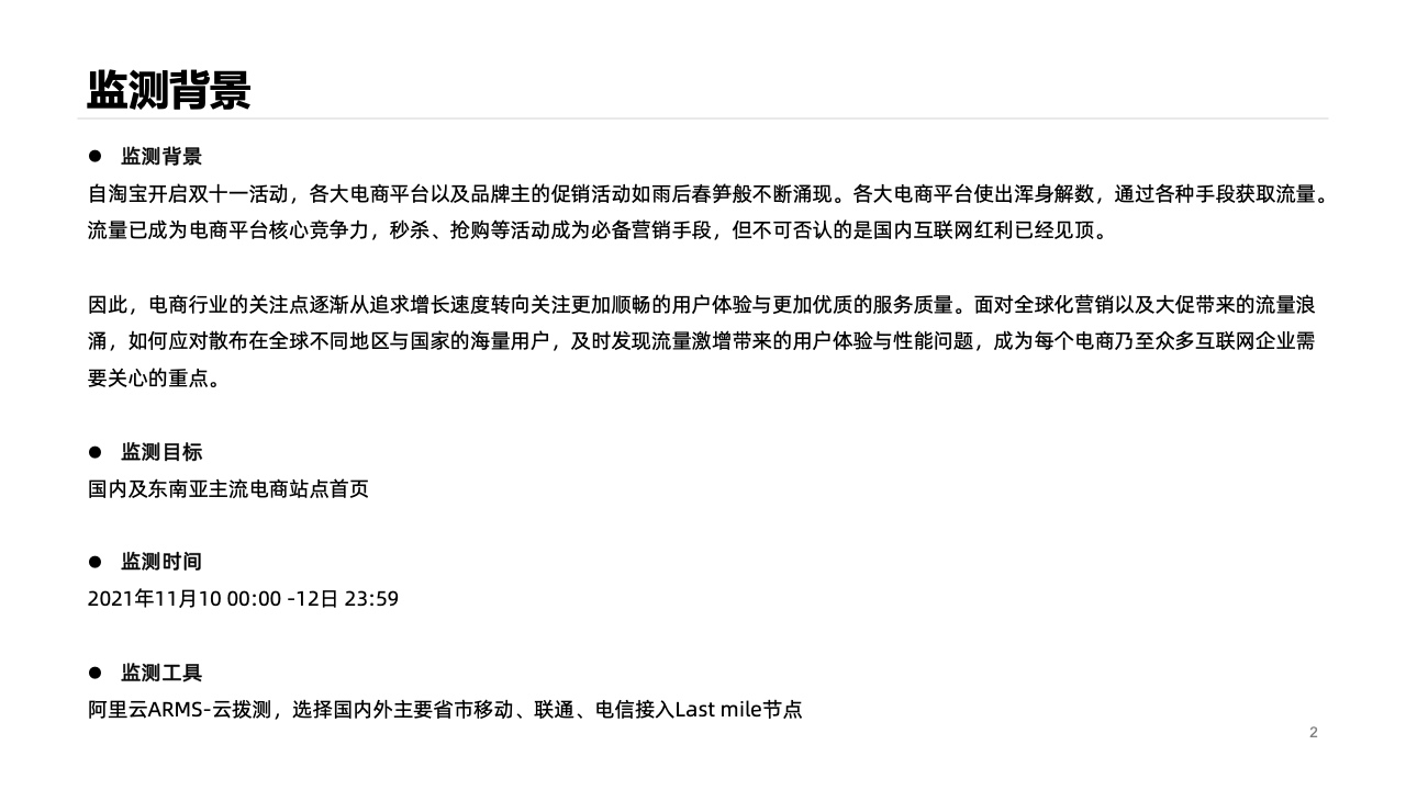 雙十一作為互聯(lián)網(wǎng)行業(yè)最早最大的購(gòu)物盛宴,直播、秒殺、滿減、定金,等各種手段層出不窮。但這些背后,用戶體驗(yàn)都是重要的組成部分。因此,博睿數(shù)據(jù)基于阿里云 ARMS 云撥測(cè)產(chǎn)品,出品《雙十一電商行業(yè)網(wǎng)站用戶體驗(yàn)報(bào)告》,旨在與眾多互聯(lián)網(wǎng)從業(yè)者共同了解面對(duì)全球化營(yíng)銷以及大促帶來(lái)的流量浪涌,電商行業(yè)各大玩家如何應(yīng)對(duì)散布在全球不同地區(qū)與國(guó)家的海量用戶,及時(shí)發(fā)現(xiàn)流量激增帶來(lái)的用戶體驗(yàn)與性能問(wèn)題。