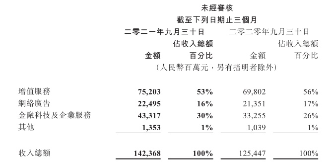 從營收構(gòu)成上看,騰訊主營收入分別為增值服務(wù)、網(wǎng)絡(luò)廣告以及金融科技及企業(yè)服務(wù)三部分組成。其中,增值服務(wù)又包括游戲和社交網(wǎng)絡(luò)收入(視頻、音頻等用戶付費(fèi)收入)兩部分。