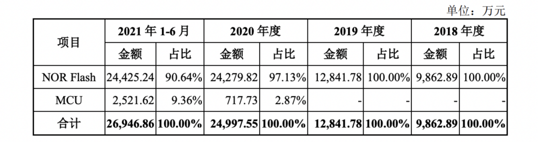 招股書顯示,公司是一家主營業務為存儲芯片和MCU芯片研發、設計及銷售的集成電路設計企業。公司現有主營產品包括 NOR Flash 存儲芯片和基于 Arm®Cortex®-M0+內核架構的通用 32 位MCU芯片,主要應用于消費電子、物聯網、通信、工業控制、汽車電子、計算機及人工智能等領域。其中,NOR Flash是公司主營業務收入的主要來源,貢獻逾九成營收。