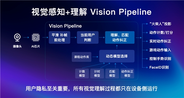 在這一過程中,用戶的隱私至關重要。在添添智能健身鏡上,AI邊緣計算芯片捕捉到的都是骨骼關鍵點而非圖片,所有視覺理解算法都是在設備本地化而非通過云端計算來完成,用戶大可放心自己的隱私。