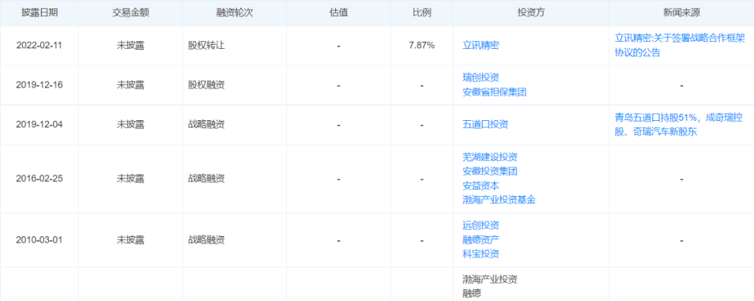 奇瑞汽車融資經歷,截圖自天眼查