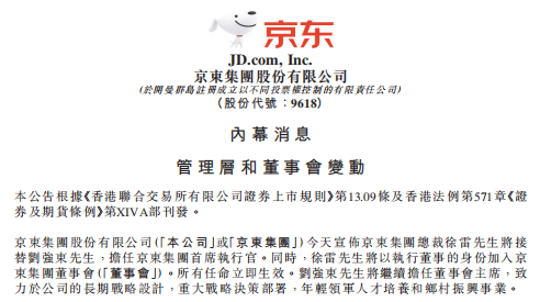 4月7日,京東集團發布公告稱,京東集團總裁徐雷將出任京東集團CEO,負責日常運營管理。劉強東將把更多精力投入到長期戰略設計、重大戰略決策部署、年輕領軍人才培養和鄉村振興事業。