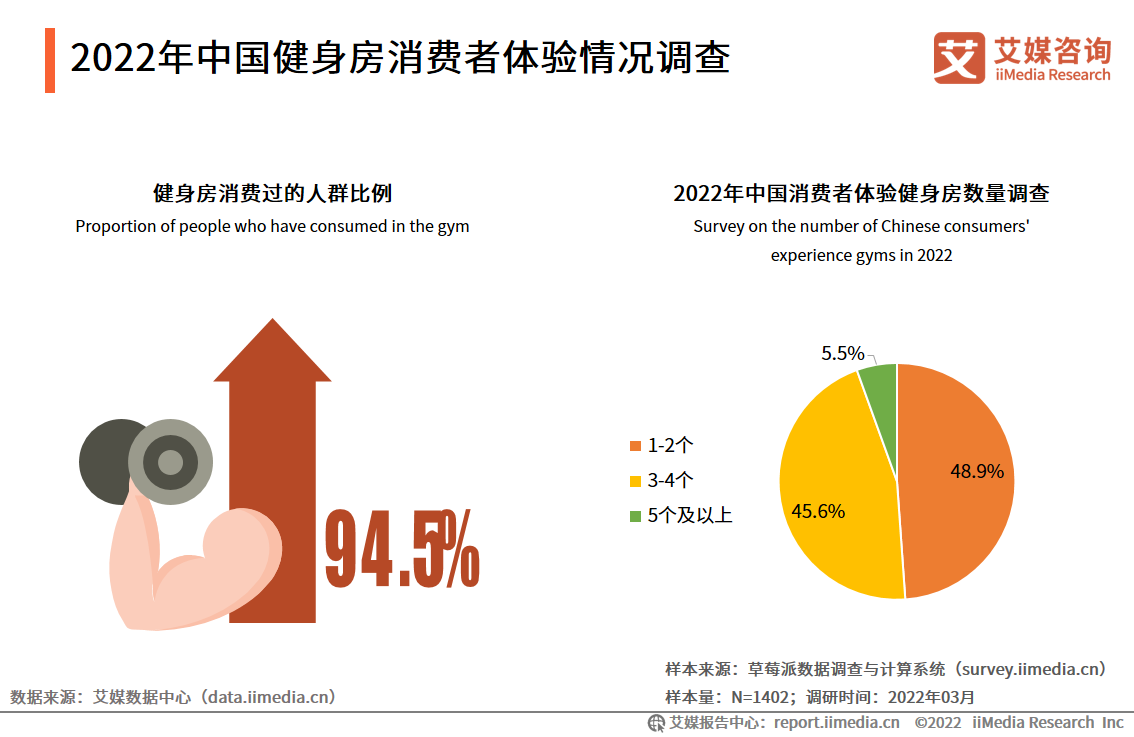 調研數據顯示,有超九成的受訪網民在健身房消費過,其中48.9%在1-2家健身房體驗過,45.6%體驗過3-4家的健身房。