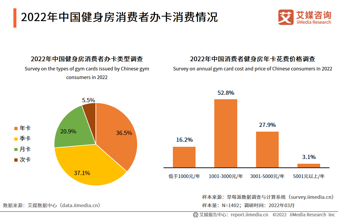 調研數據顯示,消費者辦理健身卡的形式主要是以季卡(37.1%)和年卡(36.5%)為主;按年卡計算,平均價格在1001-3000元區間內。