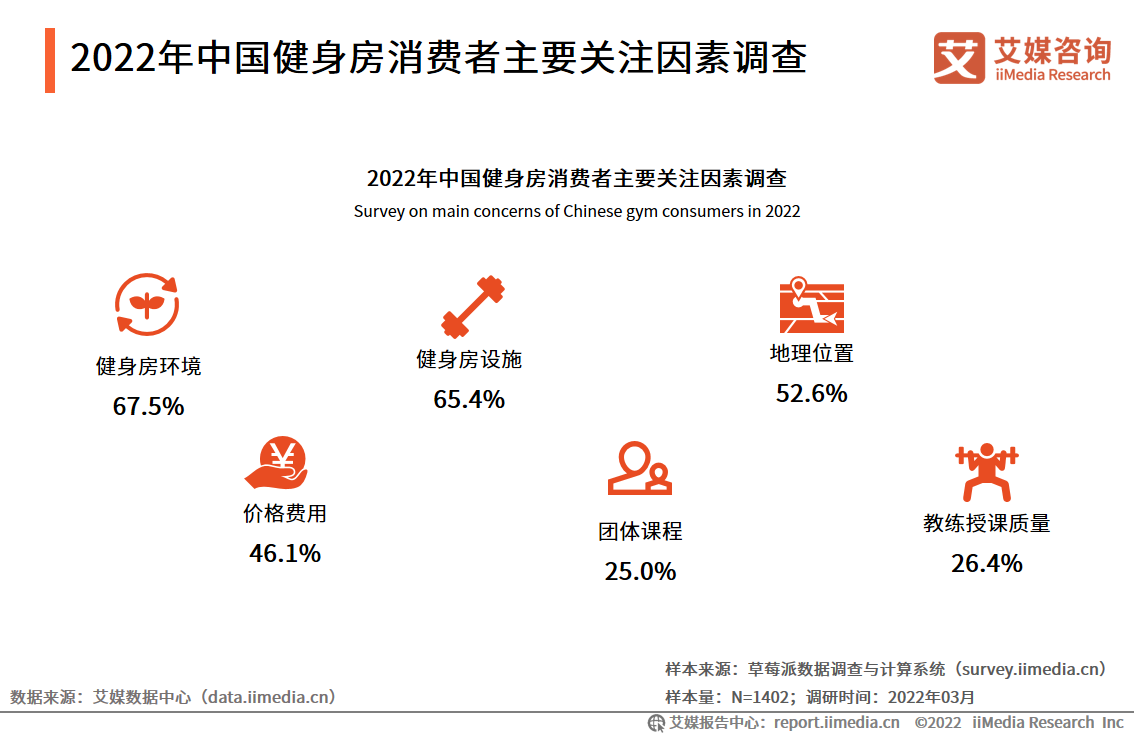 調研數據顯示,中國健身房消費者最重視健身房環境(67.5%)以及健身房設施(65.4%),其次是地理位置(52.6%)和價格費用(46.1%)。健身房的環境是消費者對于健身房的第一印象,環境、設施好壞決定了消費者對該健身房的滿意程度,地理位置以及價格費用影響消費者后續是否會在該健身房辦卡的決定。