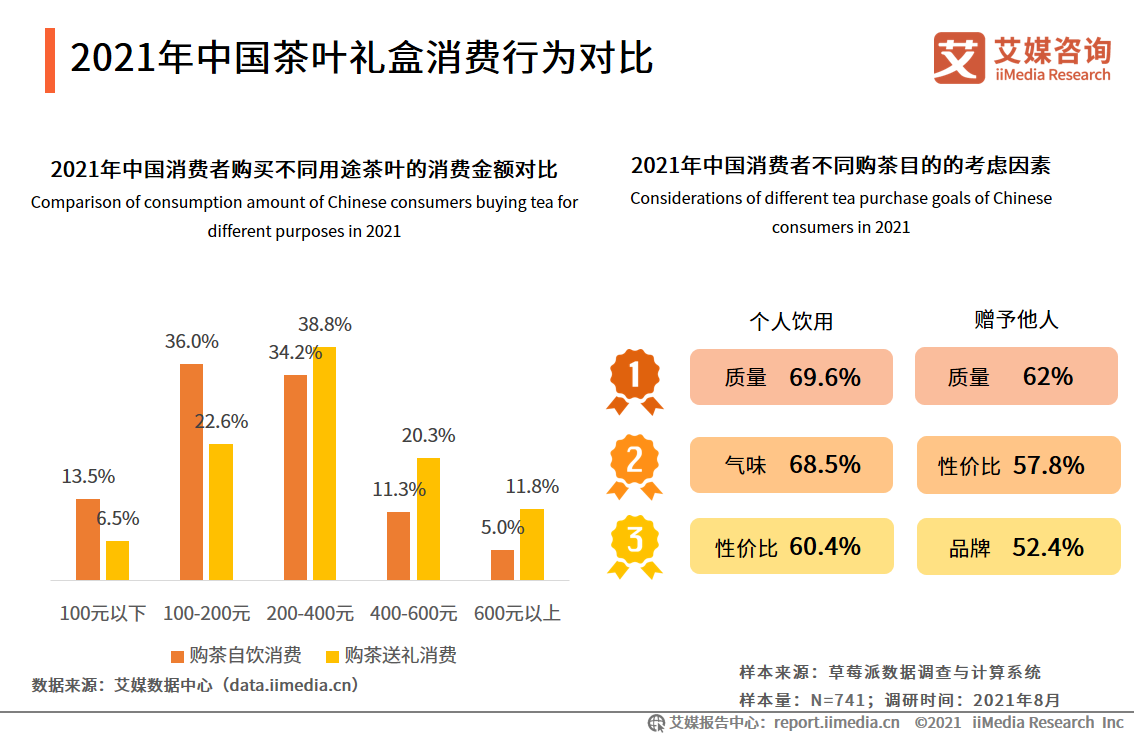 艾媒咨詢分析師認為,消費者對用于自用的茶葉更關注茶葉本身的品質,而對用于送禮的茶葉,價位接受度整體更高,同時也比較注重茶葉的品牌、包裝等附加價值。