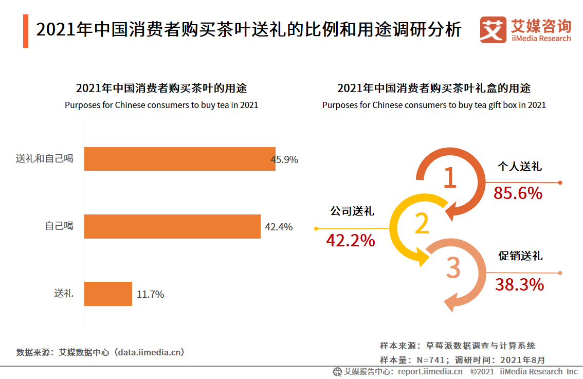 艾媒咨詢數據顯示,大部分消費者購買茶葉禮盒用于送禮,其中個人送禮和公司送禮的比例分別達到(85.6%)和(42.2%)。艾媒咨詢分析師認為,茶葉禮盒的包裝和高品質茶品在禮品市場具有廣闊的市場前景。針對顧客的口味、年齡等給顧客選取性價比較高的茶葉,搭配不同的茶葉禮盒,專門定制,同時配合 “生態”“綠色”的健康品牌,正在成為市場的新寵。