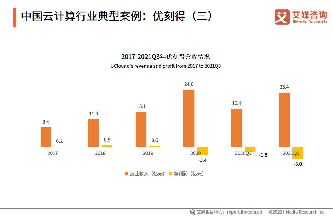 數據顯示,優刻得的營業收入在2017-2020年呈增長趨勢,截止到2021年第三季度,優刻得的營業收入為23.4億元,2021年全年的營業收入有望超過2020年。在業績穩步增長的同時,優刻得的凈利潤虧損卻在逐年擴大。艾媒咨詢分析師認為,云計算產業是一個重投入、重建設的賽道,資本開支較大,云計算企業需要尋找更多的補給點,形成自己的產品差異化優勢,才有機會快速實現商業變現,扭轉虧損的局面。