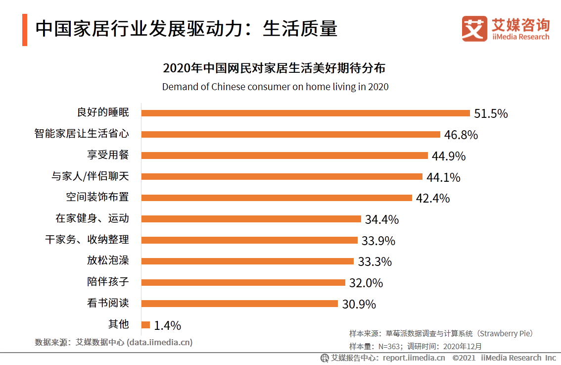 艾媒咨詢?cè)缜罢{(diào)研數(shù)據(jù)顯示,逾五成受訪網(wǎng)民希望擁有良好的睡眠,超過(guò)46%的網(wǎng)友期待智能家居能讓生活省心。另外,消費(fèi)者對(duì)居家用餐、健身、閱讀等方面都有“質(zhì)”的追求。