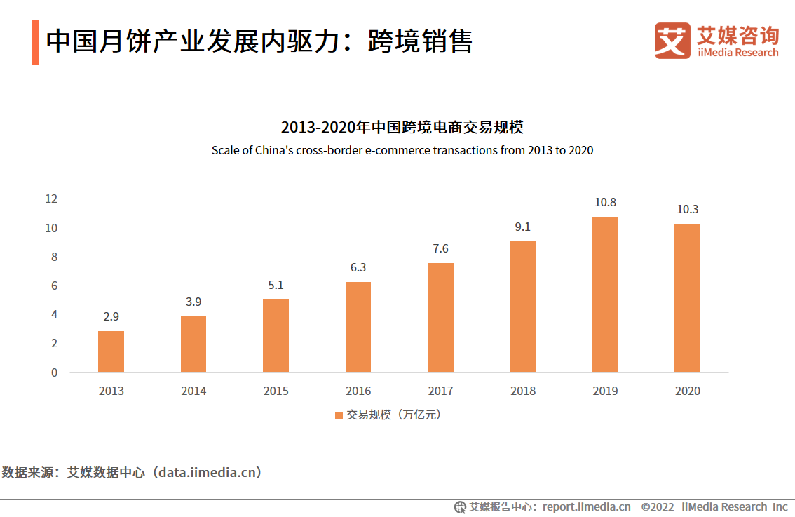 數據顯示,中國跨境電商交易規模逐年擴大,2020年由于受到疫情的影響,中國跨境電商交易市場規模有所下滑,交易規模為10.3萬億元。艾媒咨詢分析師認為,月餅的生產逐漸朝著小型化、低糖化、多樣化的方向發展,更加符合西方現代餐飲的營養標準。跨境電商擴大了月餅的銷售范圍,月餅由國內作為傳統食品銷售,逐漸擴大到海外市場。