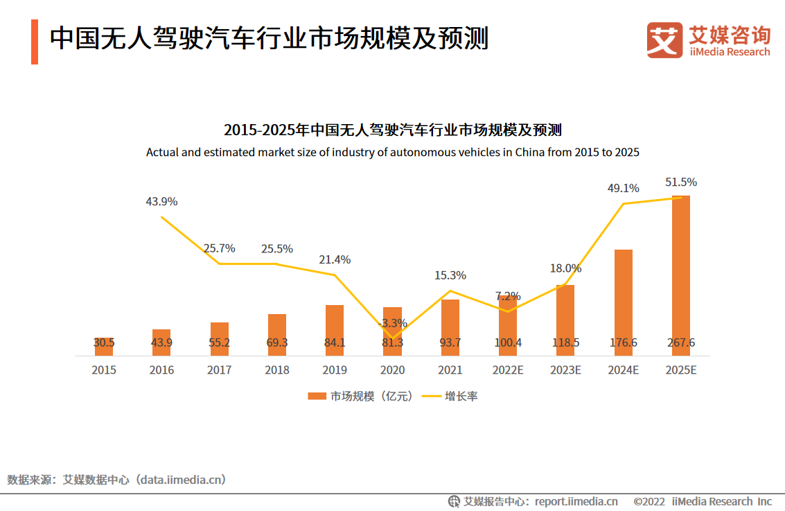 艾媒咨詢數據顯示,雖然受疫情影響,2021年中國無人駕駛汽車市場規模有所下滑。但行業整體保持著穩定增長的態勢,2022年無人駕駛汽車市場規模將達100.4億元,預計2025年前后將迎來規模性產業化契機。在政策、技術發展、社會需求等多維度因素的推動下,無人駕駛汽車的應用更加廣泛, 使自動駕駛的服務需求持續增長。