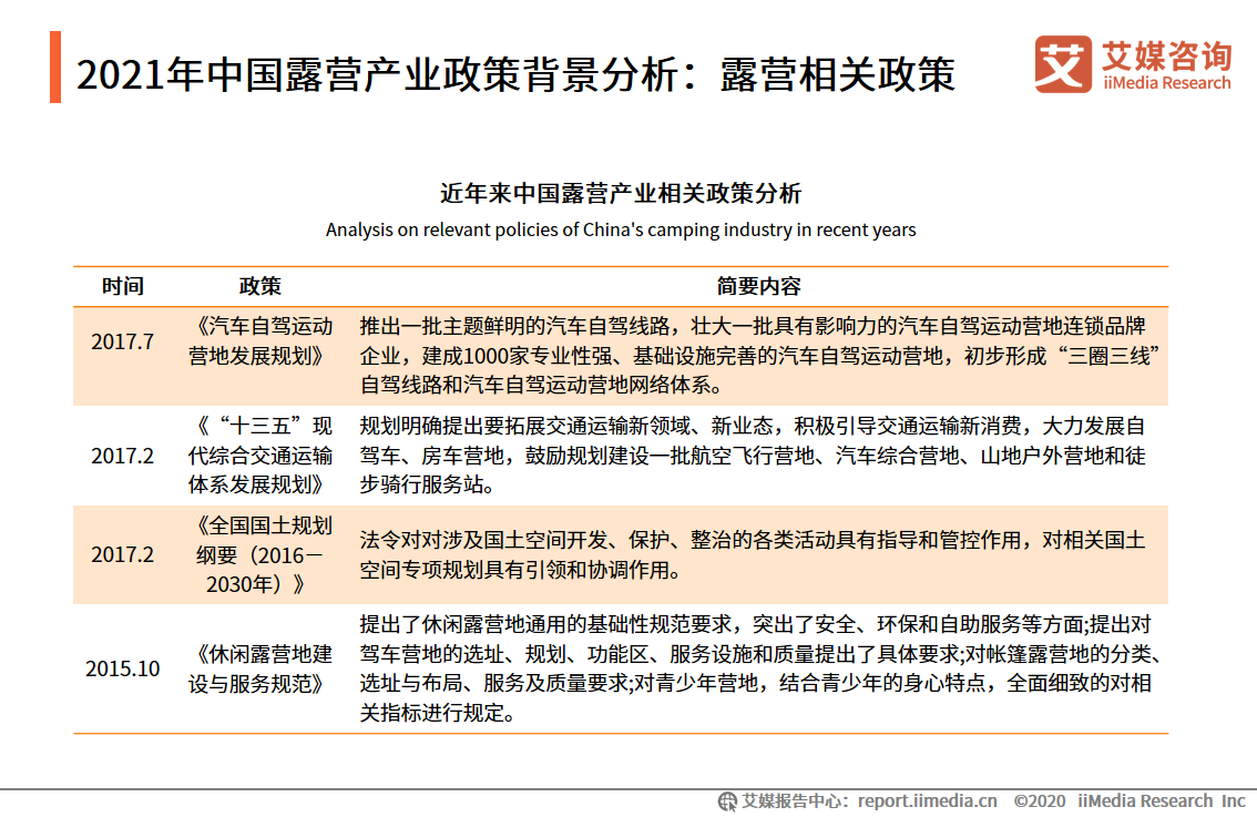 2015-2017年,中國(guó)政府出臺(tái)了多項(xiàng)露營(yíng)產(chǎn)業(yè)相關(guān)政策,對(duì)露營(yíng)產(chǎn)業(yè)的發(fā)展起到重要的推動(dòng)作用。艾媒咨詢分析師認(rèn)為,隨著露營(yíng)經(jīng)濟(jì)的關(guān)注度不斷提升以及規(guī)模不斷擴(kuò)大,政府將持續(xù)推進(jìn)露營(yíng)產(chǎn)業(yè)的相關(guān)政策以進(jìn)一步規(guī)范市場(chǎng)。