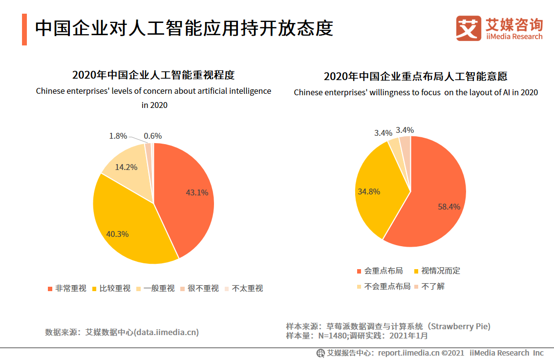 艾媒咨詢調研數據顯示,43.1%的受訪企業表示對人工智能非常重視,且超95%的受訪企業表示重視人工智能成果的應用;58.4%的中國企業表示會重點布局人工智能領域。