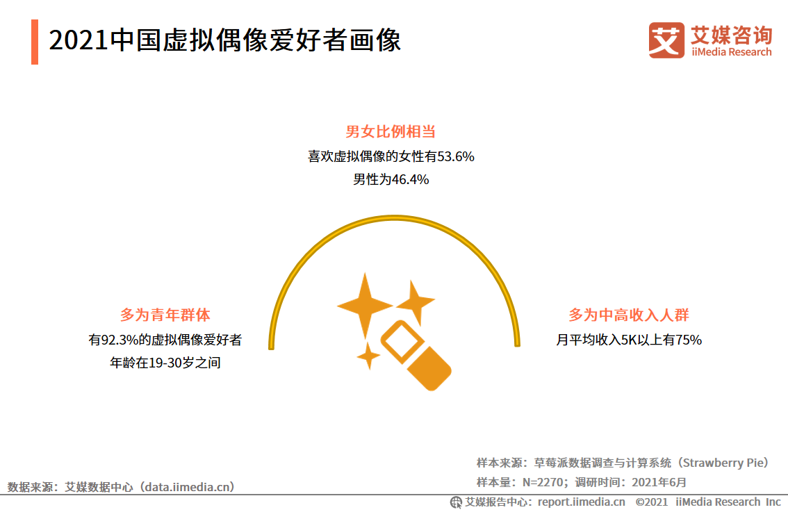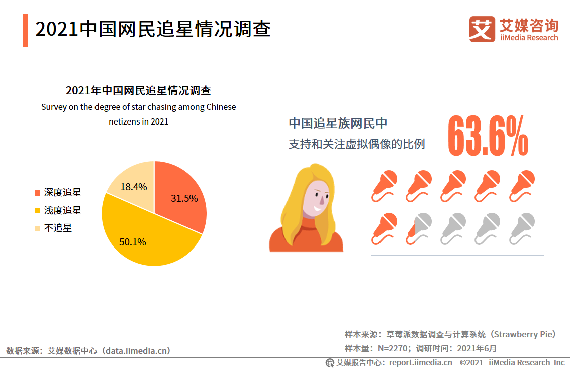 iiMedia Research(艾媒咨詢)數據顯示,有八成以上的網民都有追星行為,其中喜歡追虛擬偶像的有63.6%的網民。艾媒咨詢分析師認為,虛擬偶像或許沒有成人的思想,但根據粉絲需求策劃的偶像,能最大程度滿足粉絲的想象,有利于積累更龐大的粉絲群體。