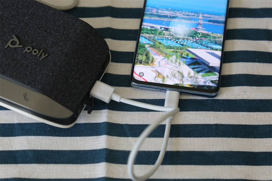 在產品具有便攜特點的同時,Poly Sync10還擁有易收納的特點。背面人性化設計有收納槽和機身USB-A數據充電線,在使用之余可以將機身數據線纏繞在底部的收納槽,卡好USB-A頭。