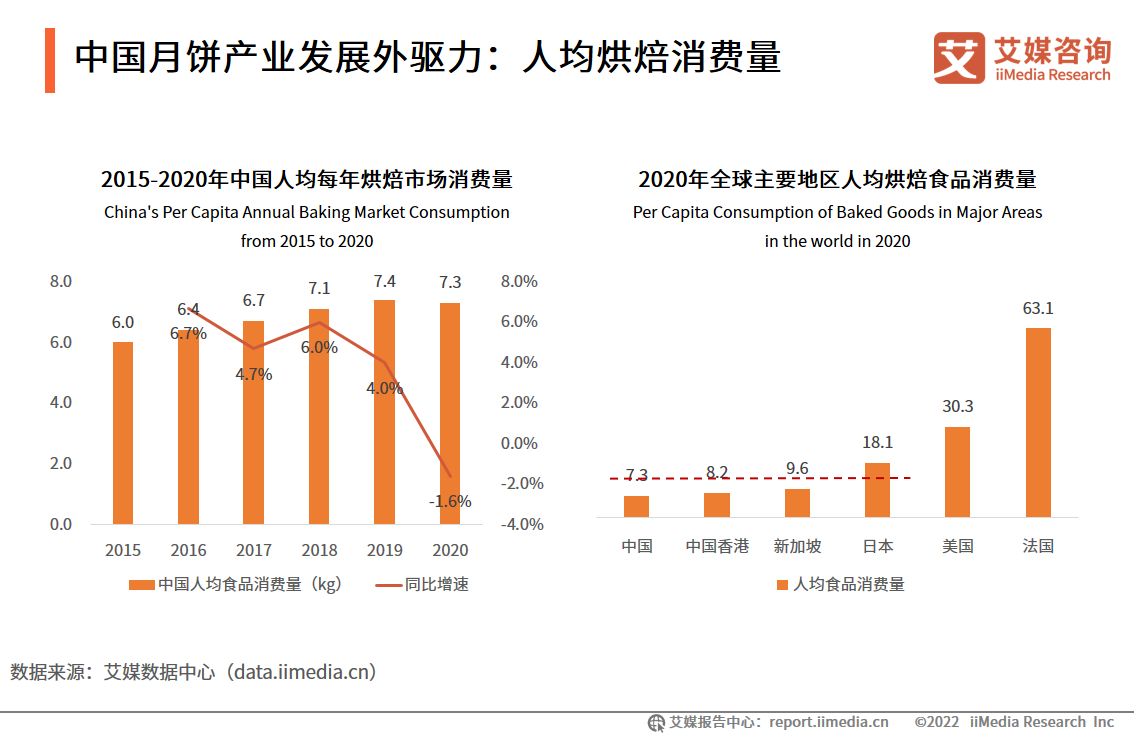 數據顯示,2020年中國人均每年烘焙食品消費量受到疫情影響增速略有下滑,人均消費7.3公斤。中國人均消費量與全球主要國家及地區對比,中國的人均烘焙食品消費量不及飲食結構相同國日本的一半。艾媒咨詢分析師認為,我國正處于消費升級階段,并且人均消費量呈上升趨勢,未來我國烘焙行業人均消費量有望持續上升。