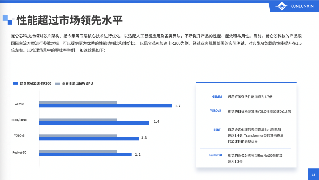 經過昆侖芯對芯片架構、指令集,包括軟硬件等等各種核心技術的聯合優化,昆侖芯的通用性和性能已經達到了非常高的水平。目前昆侖芯2代的推理板卡R200跟業界主流150W的GPU相比能夠達到平均1.5到2倍的性能提升。這在實際的業務應用和場景中為客戶切切實實地實現了降本增效,促進了產業的發展。