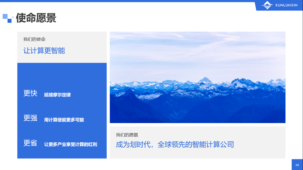 昆侖芯這家公司其實比較年輕,今年六月一號兒童節一周年。公司雖然年輕,但愿景卻很宏偉,我們希望“成為劃時代、全球領先的智能計算公司”。計算有不同的周期、各個時代,人工智能是一個新的時代。我們希望在人工智能時代占有一席之地、獲得領軍地位。