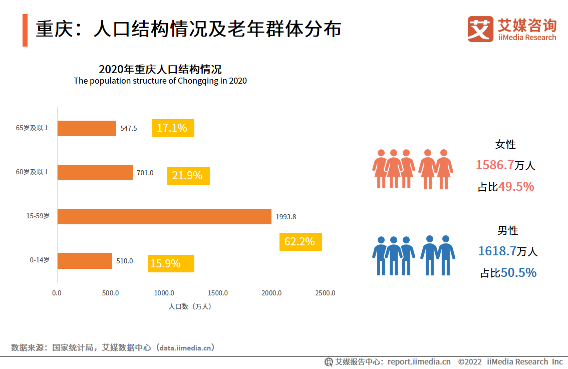 iiMedia Research(艾媒咨詢)數據顯示,2020年重慶0-14歲人口為510.0萬人,占總人口15.9%;15-64歲人口為1993.8萬人,占62.2%;65歲及以上人口為701.0萬人,占21.9%,比2020年全國13.5%高8.4個百分點。重慶65歲及以上老年人口數量多,社會處于深度老齡化狀態,人口老齡化程度大大高于全國水平。