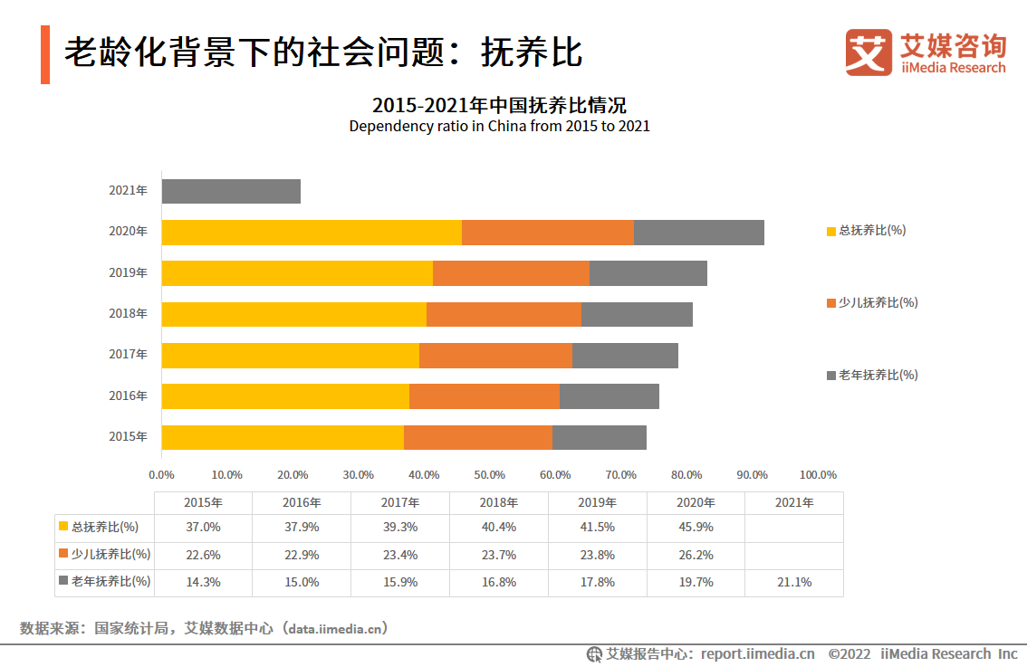 iiMedia Research(艾媒咨詢)數據顯示,2021年老年撫養比21.1%,意味著平均5名年輕人要撫養一位老人;2020年少兒撫養比為26.2%,平均4名年輕人要撫養一個少兒。人口老齡化使老年撫養比大幅上升,并且撫養老人和養育小孩成本高昂,年輕人“兩頭承壓”。社會生育意愿不強導致少兒撫養比下滑,年輕人口規模萎縮,社會養老負擔進一步加重。