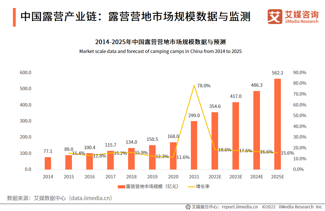 數(shù)據(jù)顯示,2014年至2021年中國露營營地市場規(guī)模從77.1億元增至299.0億元,復合增長率18.5%。疫情基本控制后, 2021年露營營地市場規(guī)模快速增長,增長率達78.0%。預計2022年增速達18.6%,市場規(guī)模達354.6億元。艾媒咨詢分析師認為,露營營地市場規(guī)模受到整體旅游市場增長帶動,加之消費者更傾向于短途旅游和親近自然,預計未來營地市場規(guī)模將持續(xù)擴大。