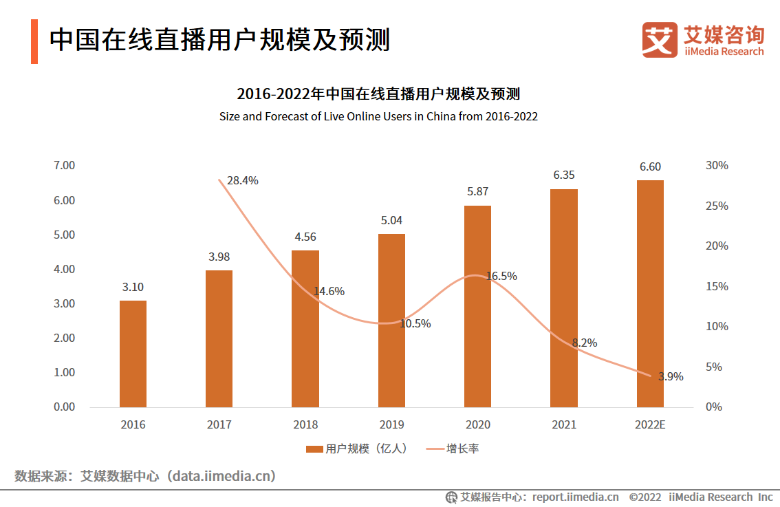 iiMedia Research(艾媒咨詢)數據顯示,2022年移動電商用戶規模有望達到8.69億人,但增幅有所下降。艾媒咨詢分析師認為,隨著電商體系在中國發展成熟,用戶規模逐漸觸達網民規模天花板,流量獲取成本也越來越高,“直播+電商” 的模式已成為電商行業的一大風口。