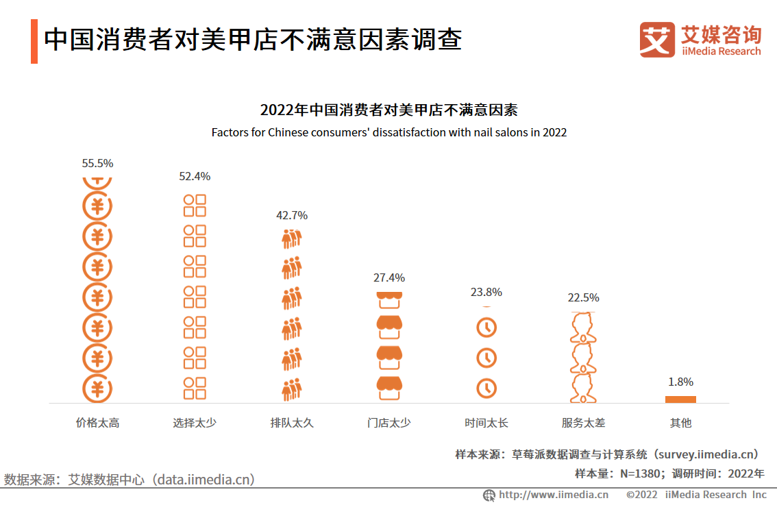 調研數據顯示,2022年中國消費者對美甲店最不滿意的因素是價格太高(55.5%),52.4%的消費者認為不滿意的因素是門店或款式選擇太少。艾媒咨詢分析師認為,價格實惠且款式多樣的美甲店是消費者的首要選擇,擴大店鋪規模、增加美甲制作人員數量有利于緩解排隊久的問題。