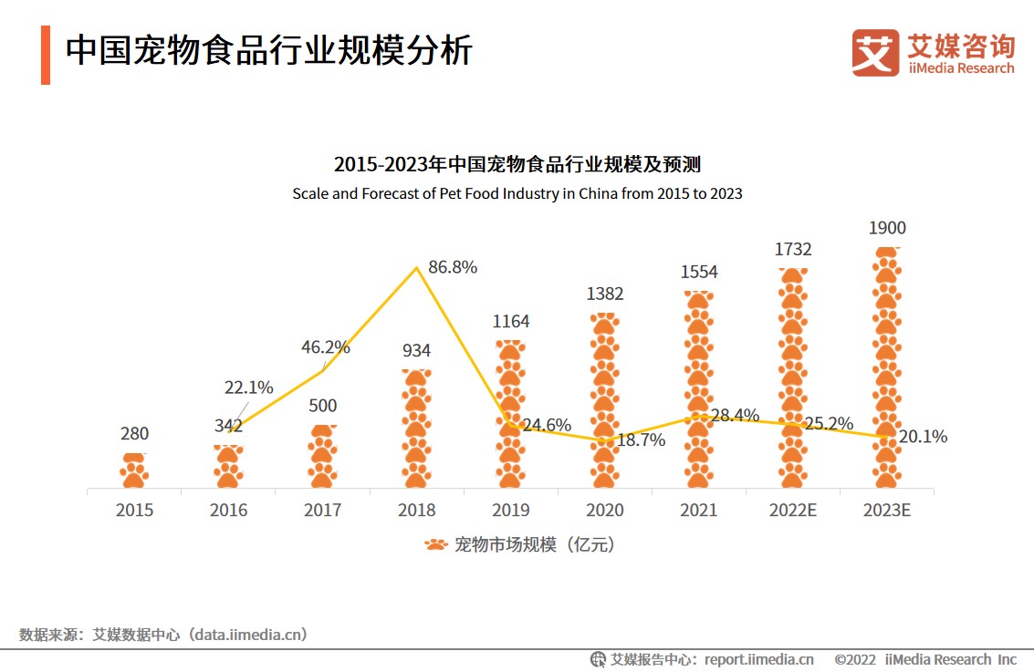 數據顯示,2021年中國寵物食品規模約1554億元,預計2022年寵物食品行業規模達到1732億元。隨著社會的發展以及養寵觀念的不斷推廣普及,高成長性的寵物行業已成為市場藍海。寵物食品高頻、消費量大的特征,吸引了很多初創企業駛入該賽道,這使得本土品牌的市占率逐步提升,海外品牌市占率逐步下降。