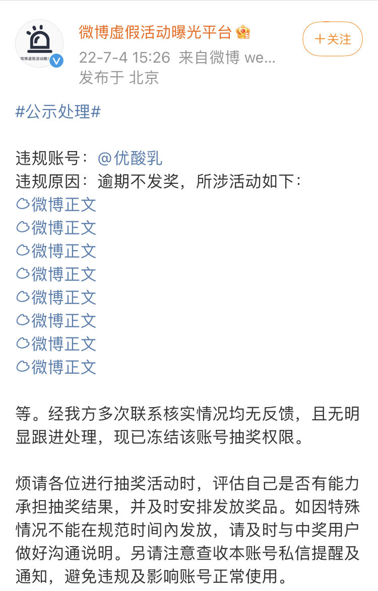 7月6日,微博虛假活動曝光平臺發文稱,經溝通,@優酸乳近日已就相關抽獎活動聯系對應中獎用戶說明情況并安排補發獎品。相關中獎用戶可查詢自己賬號私信及于中獎名單中查看獎品發放物流信息。@優酸乳 積極配合并跟進處理,現已恢復其賬號抽獎權限。