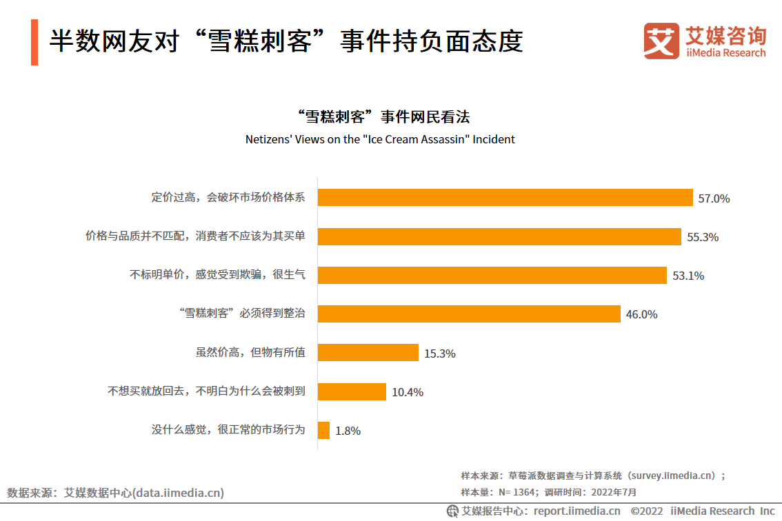 調研數據顯示,絕大部分網民對“雪糕刺客”持負面態度,其中,57.0%的網民認為“雪糕刺客”會破壞市場價格體系,55.3%的網民認為“雪糕刺客”的品質匹配不起其高價,53.1%的網民覺得受到了欺騙。在“雪糕刺客”事件中,網民反感的并非是雪糕價格的提高,而在于其不明碼標價以及品質與價格的不匹配。此外,“雪糕刺客” 是否會導致雪糕市場價格的虛高,也是網民擔憂的重點之一。