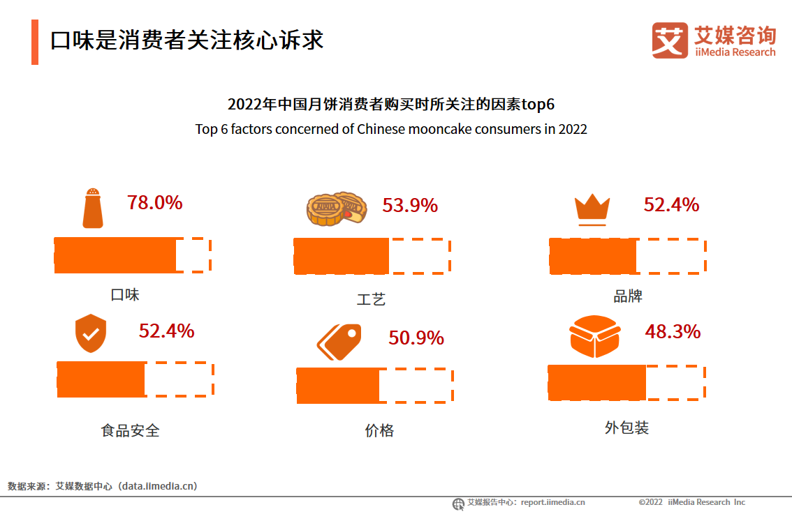 數(shù)據(jù)顯示,有78.0%的月餅消費(fèi)者在購(gòu)買月餅時(shí),更關(guān)注月餅的口味;有53.9%的消費(fèi)者關(guān)注月餅的加工工藝,價(jià)格、品牌、食品安全、外包裝等也是消費(fèi)者較為關(guān)注的因素。隨著居民消費(fèi)升級(jí),對(duì)月餅的口味需求提升,消費(fèi)者口味多元化發(fā)展。
