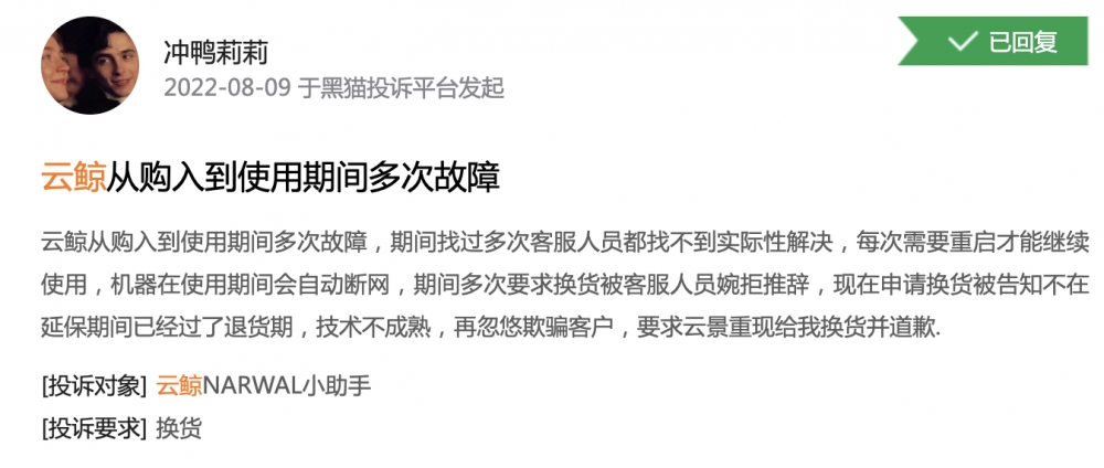 從黑貓投訴平臺和電商平臺的評價來看,云鯨掃地機的智能和質(zhì)量都存在問題。有消費者表示購買云鯨機器后出現(xiàn)多次故障,云鯨J2掃拖機器人實用后一個月無法拖地,還有消費者稱云鯨掃地機器人找不到基站充電,只能選擇退貨。