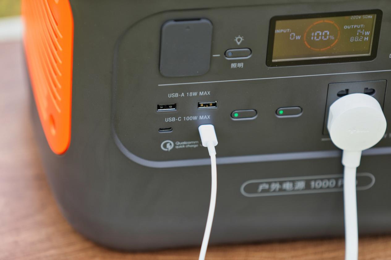在家里直接使用官方標配的AC電源線連接插座與戶外電源上的AC輸入接口即可。在充電效率上也大大提升了,官方稱最大充電效率可以達到800W,也就是說同樣是1002Wh的容量,1000Pro版本最快可1.8小時就可以充滿了。根據我們在實際測試過程中,市電充電功率穩定在可732W左右,30%左右的電量,耗時1.2個小時充滿100%,與官方數據基本吻合。