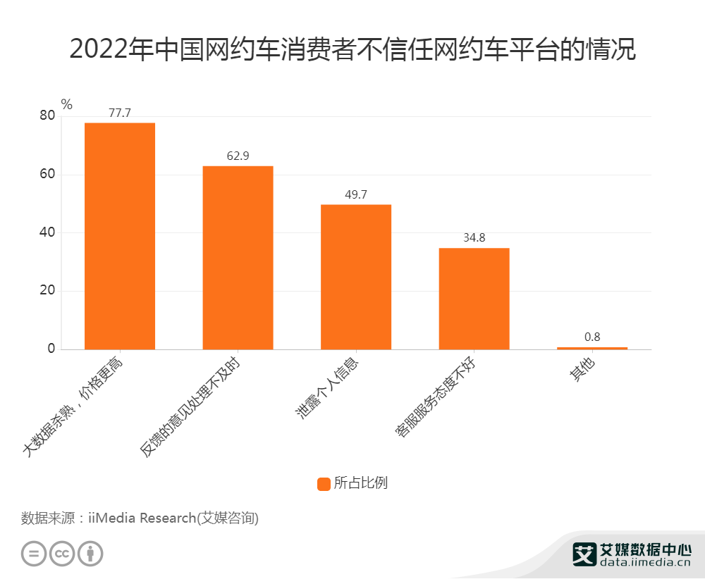 調研數據顯示,在2022年中國網約車消費者不信任網約車平臺的情況中,大數據殺熟、泄露個人信息分別占77.7%和49.7%。大數據殺熟的情況不單單存在于網約車,只要涉及到線上購買,難免會有大數據殺熟漲價的情況。