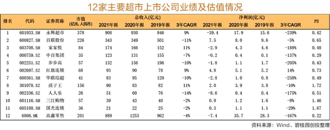 與電商的寡頭格局不同,目前國內線下商超市場集中度極低。報告認為,美國線下商超誕生了多家穿越周期、市值千億美元的明星企業,而中 美兩國社會消費品零售總額基本相當,中國人口是美國的4.2倍,目前中國尚無市值千億人民幣的商超企業,未來潛力更大。