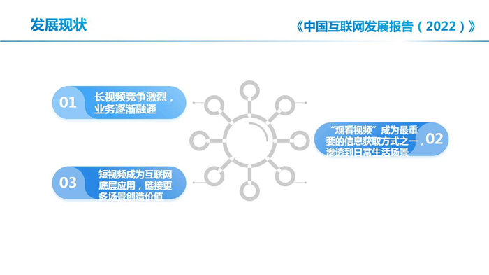 《中國互聯網發展報告(2022)》(以下簡稱“《報告》”)——第18章“2021年中國網絡音視頻發展狀況”主要包括以下幾方面內容,一是發展環境,主要介紹了網絡音視頻發展面臨的頂層設計和監管政策、相關產業狀況和經濟社會環境;二是發展現狀,主要介紹了網絡音視頻的發展特征和市場格局;三是市場與用戶規模,主要介紹了網絡音視頻行業總體及各細分領域的市場規模和用戶規模,以及用戶的行為特點;四是細分領域,主要介紹了綜合視頻、短視頻、網絡直播、網絡音頻的發展狀況和特點;五是典型案例,主要對綜合視頻平臺、短視頻平臺和音頻平臺的典型案例進行分析;六是發展挑戰,主要介紹了綜合視頻盈利困難,網絡直播亂象需持續整治等主要挑戰。