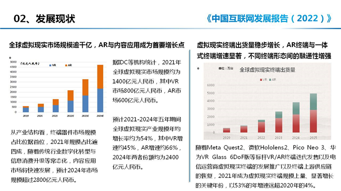 《中國互聯(lián)網(wǎng)發(fā)展報告(2022)》(以下簡稱“《報告》”)——第10章“2021年中國虛擬現(xiàn)實發(fā)展狀況”主要包括以下幾方面內(nèi)容,一是發(fā)展環(huán)境,主要介紹了我國發(fā)展虛擬現(xiàn)實的政策環(huán)境、產(chǎn)業(yè)環(huán)境和社會環(huán)境;二是發(fā)展現(xiàn)狀,主要介紹了虛擬現(xiàn)實產(chǎn)業(yè)的規(guī)模、終端出貨量等發(fā)展情況;三是關(guān)鍵技術(shù),主要介紹了虛擬現(xiàn)實“五橫兩縱”的技術(shù)體系;四是行業(yè)應(yīng)用及典型案例,主要介紹了虛擬現(xiàn)實技術(shù)在工業(yè)生產(chǎn)、會議辦公、醫(yī)療健康、教育培訓(xùn)、生活助手等場景的應(yīng)用情況。