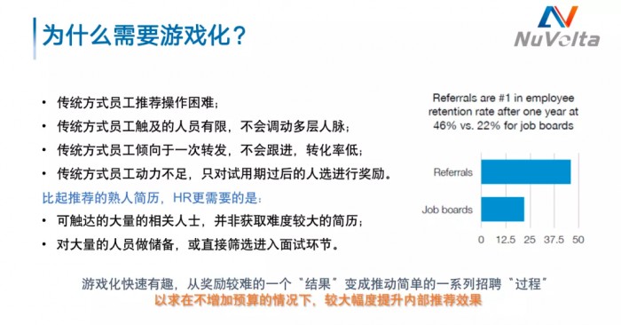 在介紹第二個核心招聘思想前,王青跟大家分享了一個伏達半導體在招聘過程中發現的有意思的事情:“我們在收到的上百份應聘工程師崗位的簡歷中發現,通過內推來的簡歷數量只有10份,但就是這10份簡歷中,最終有7個候選人面試成功,我們發現內推帶來的轉化率是極高的。在伏達半導體,大概50%以上的職位來自于內推。”那么該如何做好內推呢?如何調動員工的積極性?又該如何設置內推機制呢?王青認為,這一系列的問題都可以用“游戲化的內推方式”解決,這也是伏達半導體的第二個招聘思想,王青把它總結為3個要點: