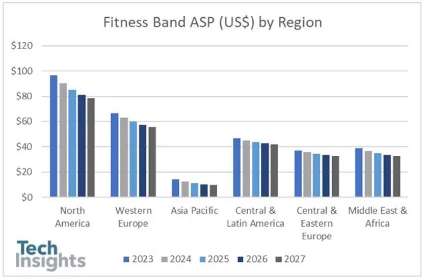 2022年健身手環平均銷售價格相對持平(-1%),而從2023年開始,平均售價也將下降,如上圖所示,健身手環的單位銷量預計將在2024年后恢復,收入下降的速度要比平均售價慢。盡管自2020年以來全球健身手環收益持續下降,但中東和非洲部分地區、中拉丁美洲以及中歐和東歐地區仍有收入增長機會。