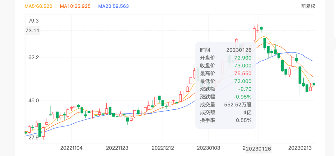 自1月26日新東方在線股價達到高點75.5元/股之后,股價就呈波動下降趨勢。其中,1月27日-2月7日,股價連續陰跌,跌去了近27%。2月8日董宇輝回歸東方甄選主號后,新東方在線股價連續兩天上漲12%。