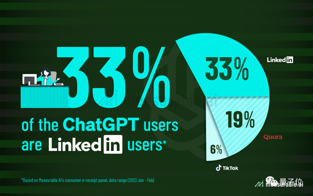 其中,Facebook拔得頭籌,有約35.6%的ChatGPT用戶在此沖浪;其次是領英,該平臺專業用戶占ChatGPT用戶總數的33%。接著是Twitter用戶約占26.4%;Quora用戶約占19%。