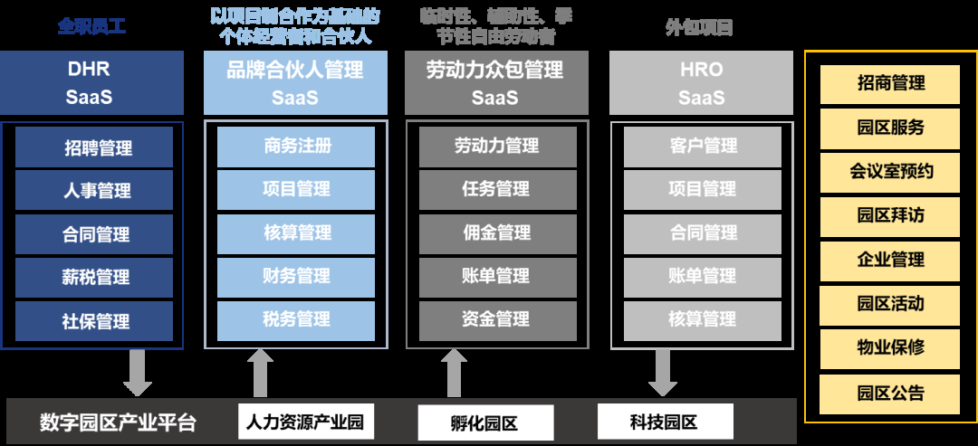 集團基于各個垂直領域行業特點,深入企業各種用工形態和用工管理維度,運用行業領先的云計算、人工智能、區塊鏈、大數據等數字技術,打造企業復合用工管理云平臺:包括勞動力眾包管理SaaS、品牌合伙人管理SaaS、數字園區產業平臺、DHR SaaS和HRO SaaS。