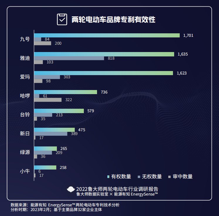 兩輪電動車行業中,傳統品牌雖入局更早,但相對有更大比例的專利為無效專利,可能為企業在持續研發過程中,發現了更好的替代技術,或經實際生產驗證對應技術成本較高/效果不理想;也可能為年限到期自然失去權力。