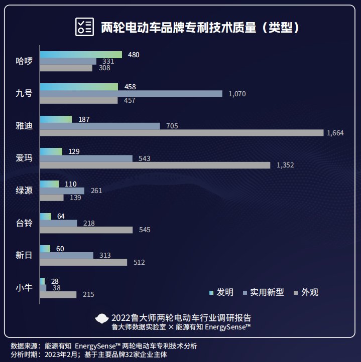 實用新型專利屬于較為實用、但價值次于發明的專利技術,兩輪電動車行業大部分品牌都擁有較多實用新型專利,反映出兩輪電動車研發上較多的技術是對于現有技術的改進運用。